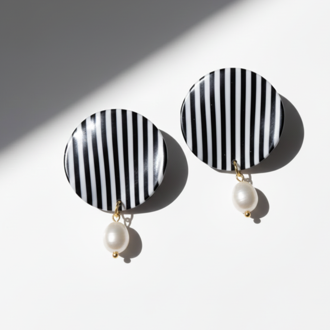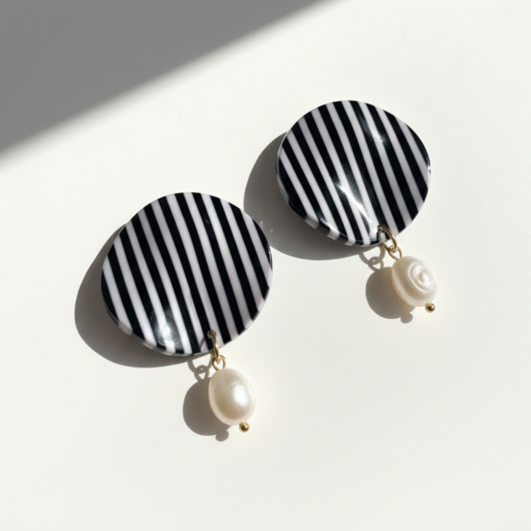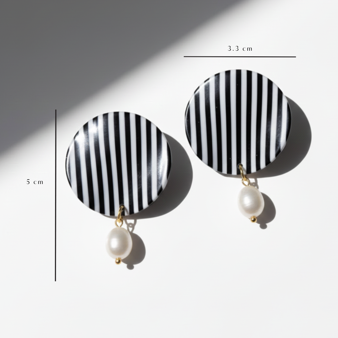 Bria combina la elegancia del blanco y negro con un toque clásico de perla. Su diseño redondo con líneas verticales estiliza y aporta un aire moderno, mientras que la perla colgante añade delicadeza. Un pendiente versátil y sofisticado para elevar cualquier look.