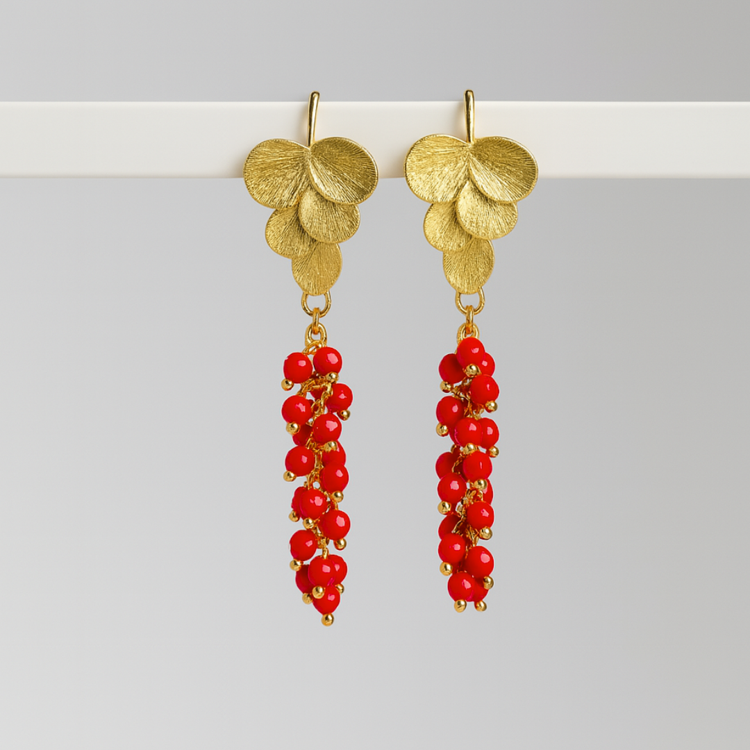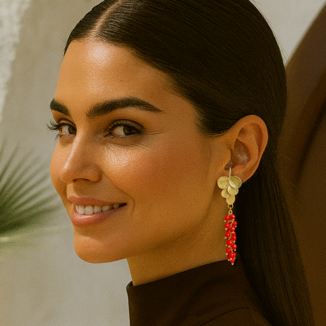 Si hay un pendiente capaz de levantar un look en un segundo, son los Giulia. Con hojas doradas  y un racimo de cuentas fucsias que bailan contigo, son alegres, elegantes y con un toque muy tú.Ligeros y favorecedores, son perfectos para invitadas atrevidas, ferias con clase o eventos donde quieres destacar sin esfuerzo.