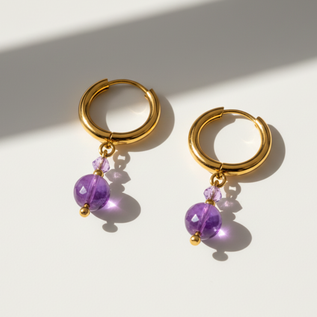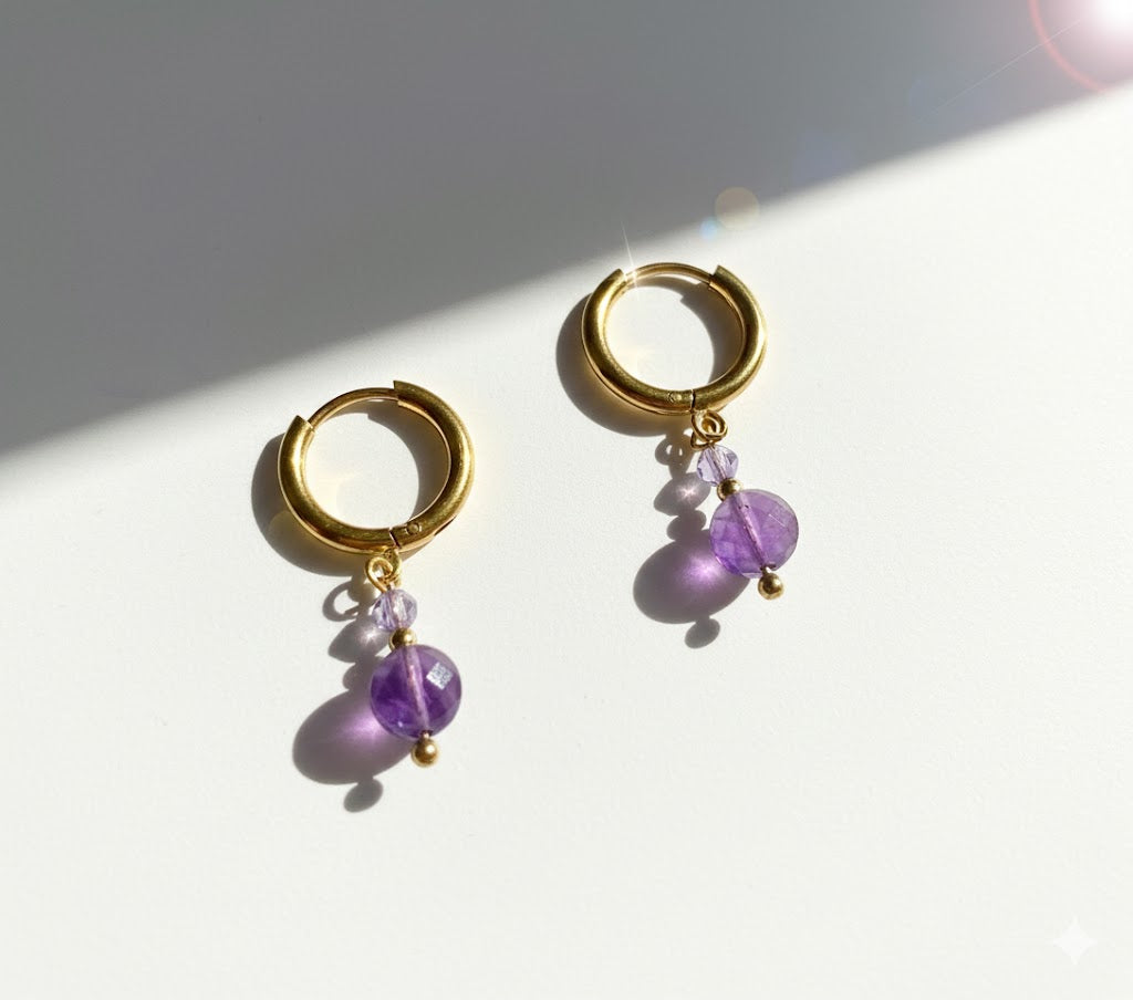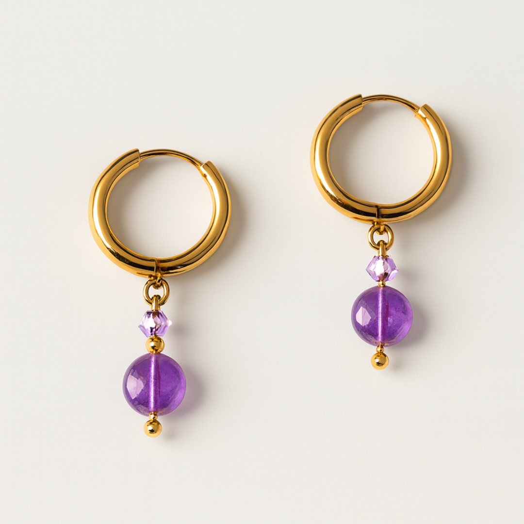 Pendientes dorados con detalle en cristal violeta que aportan un toque de luz y color. Su diseño ligero y minimalista los convierte en el accesorio perfecto para elevar cualquier look del día a día.