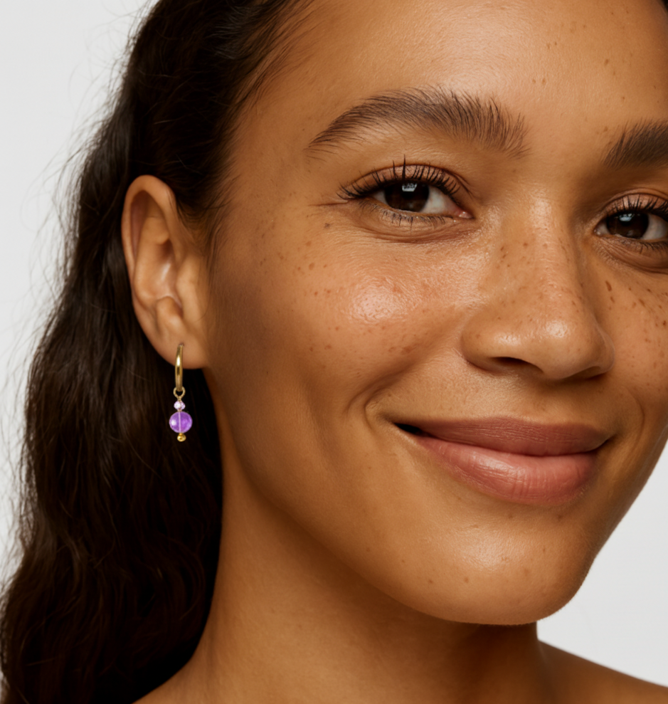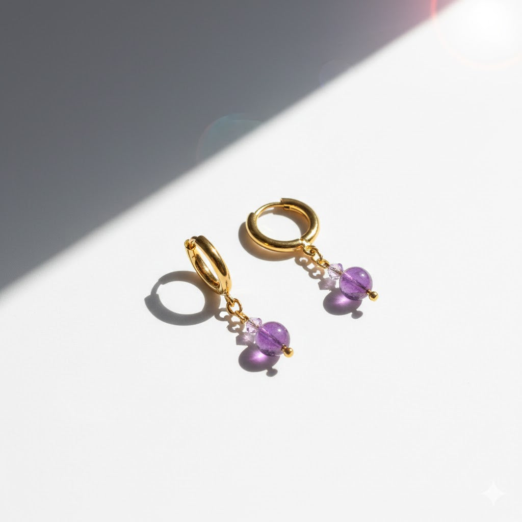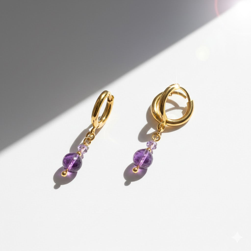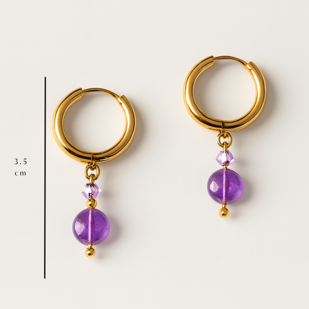 Pendientes dorados con detalle en cristal violeta que aportan un toque de luz y color. Su diseño ligero y minimalista los convierte en el accesorio perfecto para elevar cualquier look del día a día.