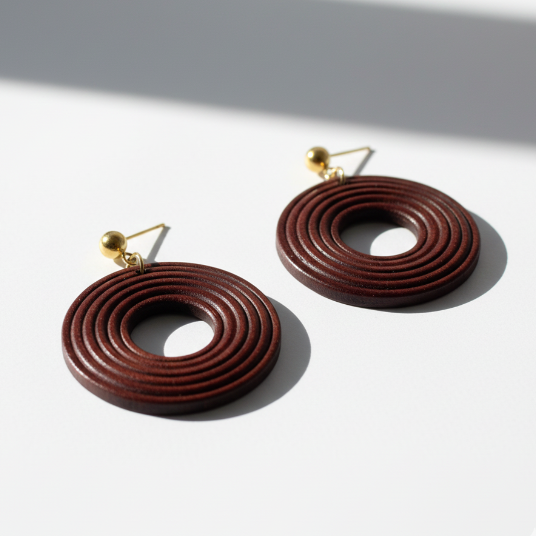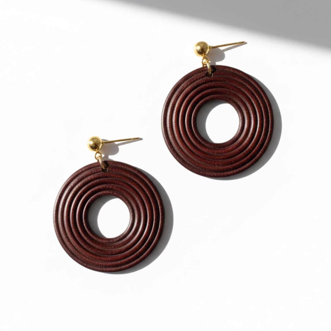 Ivia es pura geometría con carácter. Un diseño circular trabajado en capas que aporta volumen y presencia sin renunciar a la ligereza. Su acabado marrón profundo combinado con detalles dorados crea un contraste elegante y muy actual. Un pendiente que transforma cualquier look con un toque artístico y sofisticado.