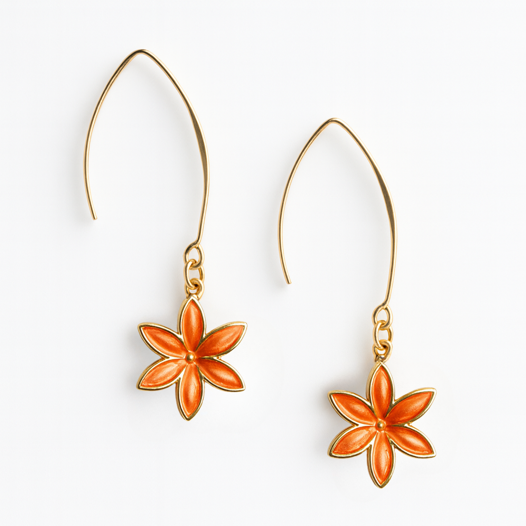 Yune es un diseño delicado y luminoso que aporta un toque femenino sin recargar. Su silueta floral, de acabado esmaltado y brillo suave, queda suspendida de un gancho estilizado que alarga visualmente el cuello y realza cualquier look. Una pieza ligera, elegante y muy especial.