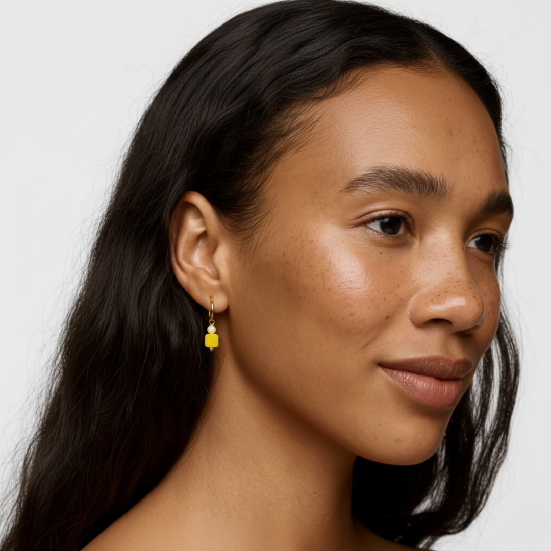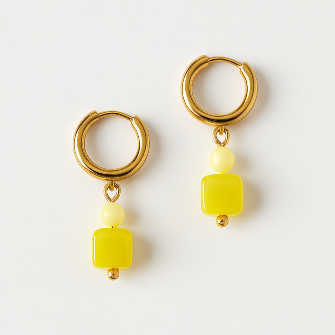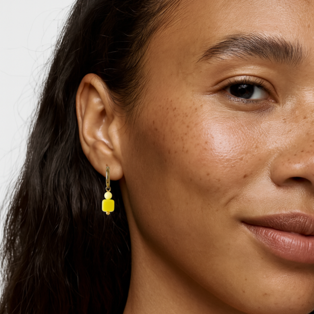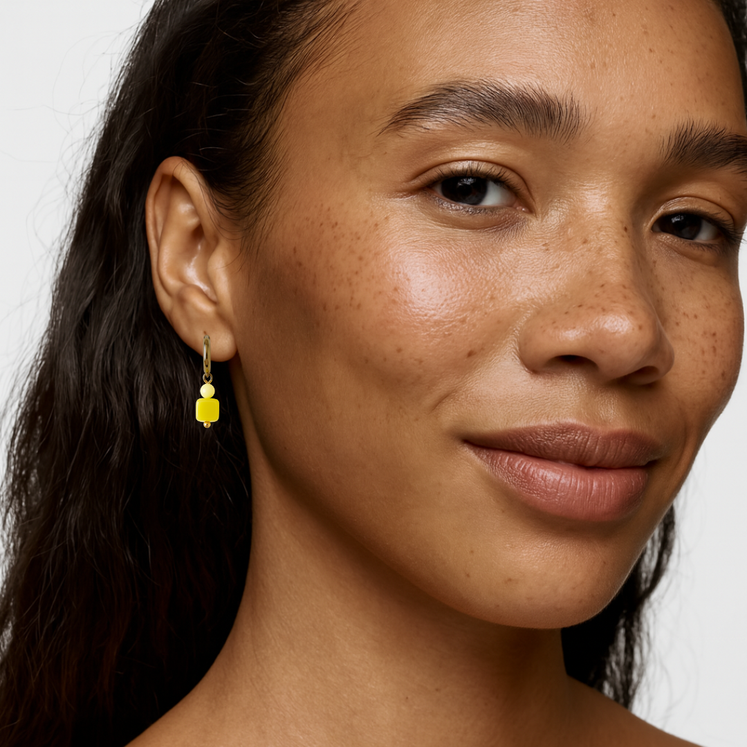 Los pendientes Atenea aportan un toque de luz y frescura gracias a sus cuentas en tonos amarillos suaves y vibrantes, combinadas con un aro dorado de acabado pulido. Su diseño es moderno, equilibrado y muy favorecedor: una pieza ligera que ilumina el rostro y aporta carácter sin resultar excesiva.
