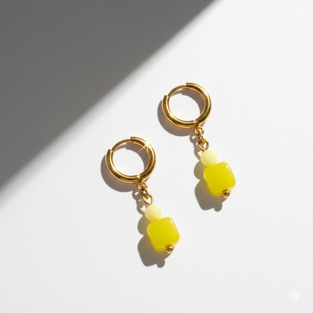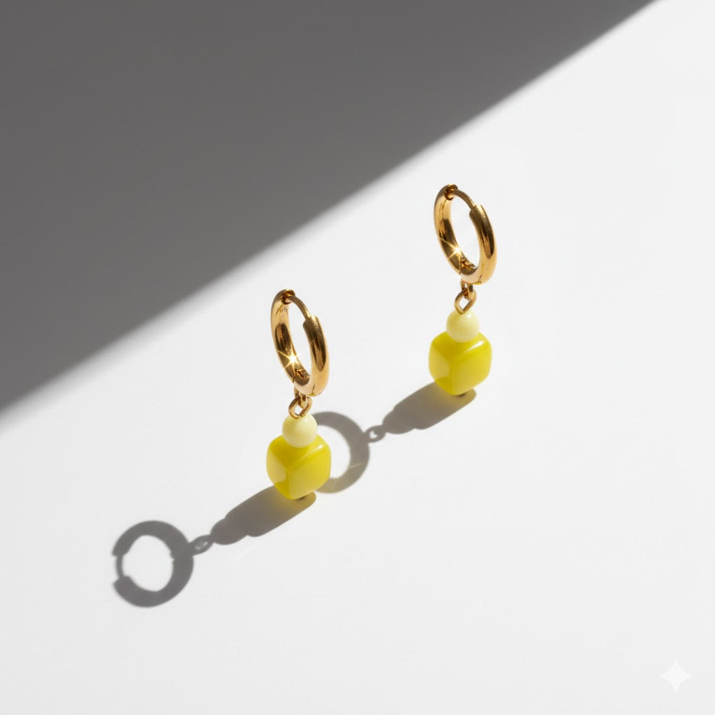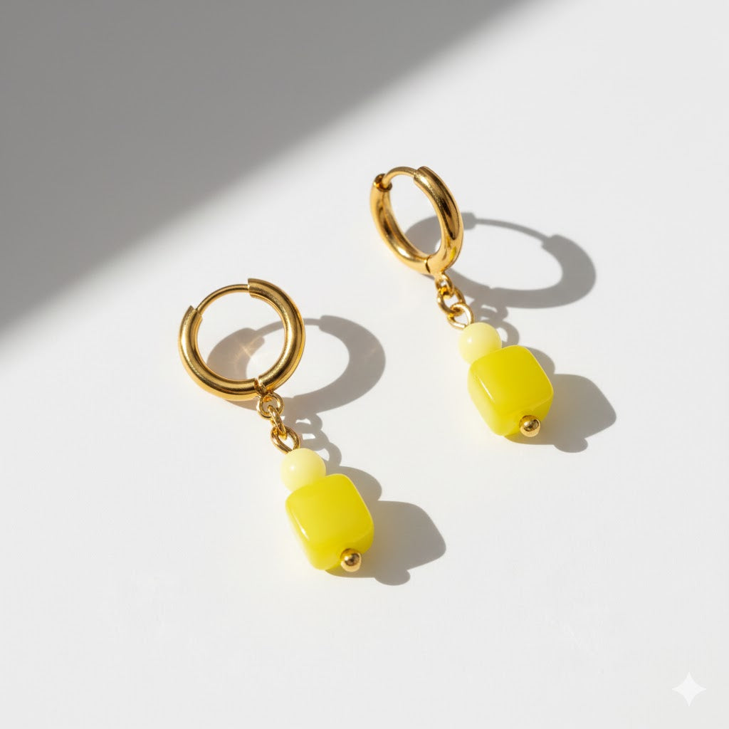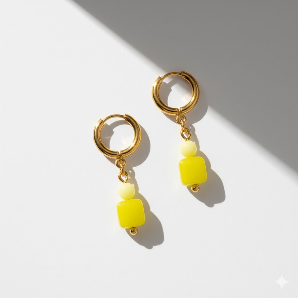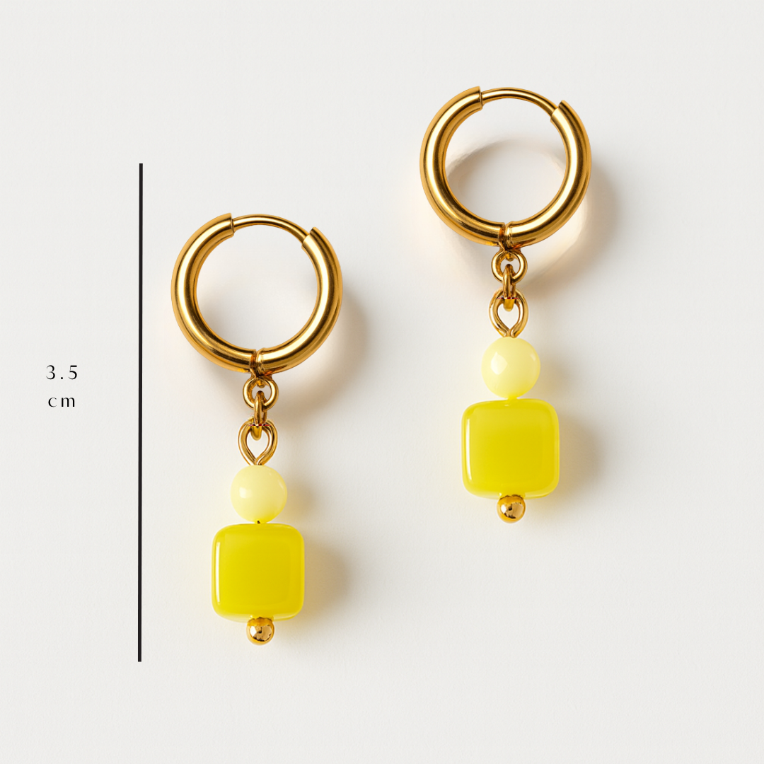 Los pendientes Atenea aportan un toque de luz y frescura gracias a sus cuentas en tonos amarillos suaves y vibrantes, combinadas con un aro dorado de acabado pulido. Su diseño es moderno, equilibrado y muy favorecedor: una pieza ligera que ilumina el rostro y aporta carácter sin resultar excesiva.