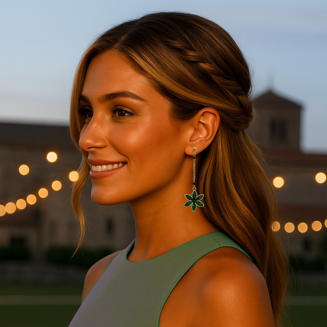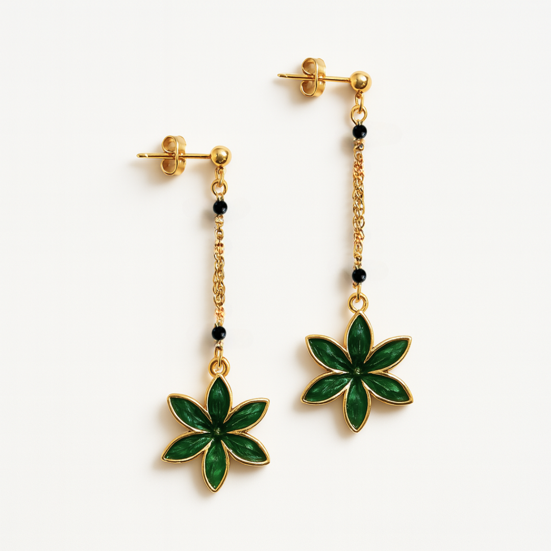 Los pendientes Gala en verde  son una oda a la primavera eterna. Su flor esmaltada con brillo suave y estructura dorada crean una pieza armónica, llena de color, alegría y sofisticación.