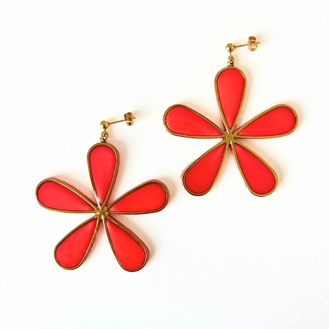 Estos pendientes combinan el encanto artesanal de la arcilla polimérica cubierta de resina con la durabilidad del acero inoxidable. Su diseño floral grande y liviano ilumina el rostro y aporta un toque alegre, ideal para bodas, eventos especiales o looks de verano.