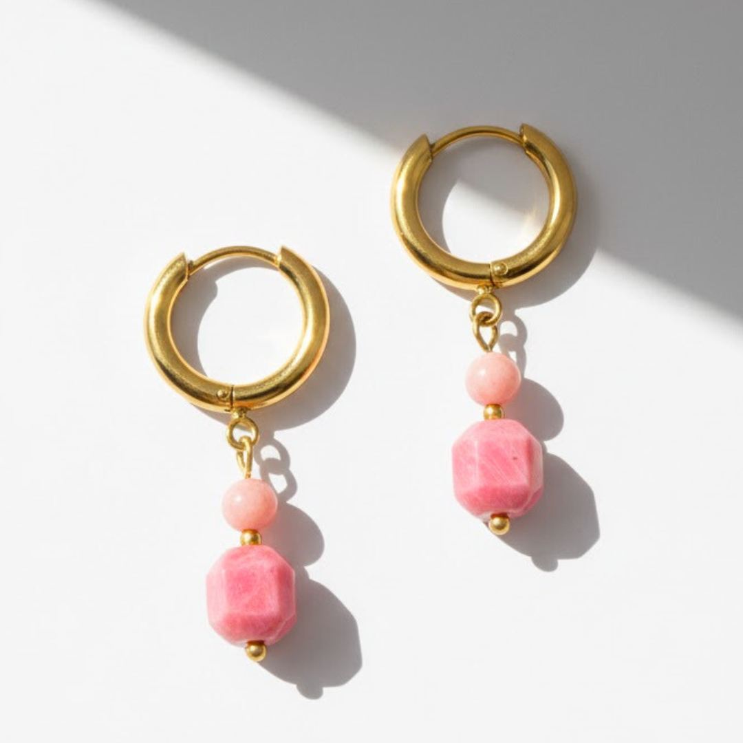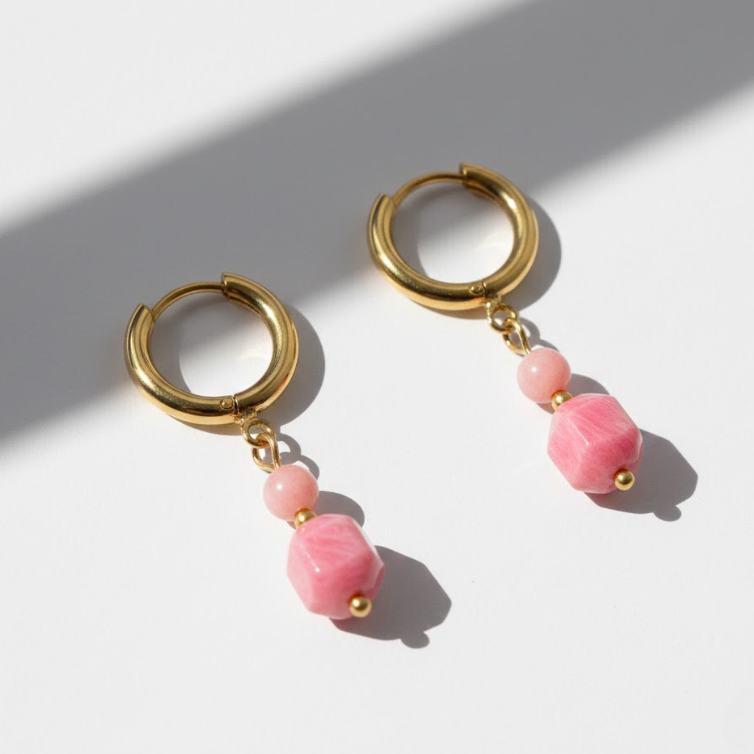 Pendientes de aro dorado con cuentas en tonos rosa pastel y rosa intenso. Una combinación suave y luminosa que aporta dulzura y color a cualquier look. Son cómodos, ligeros y perfectos para dar un toque femenino sin recargar.