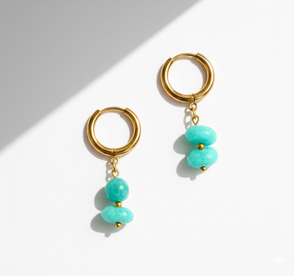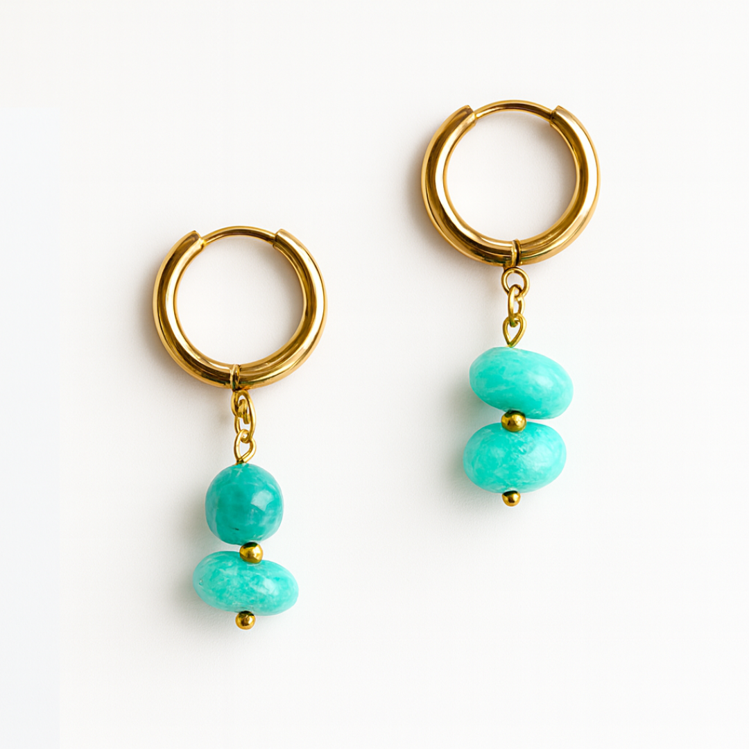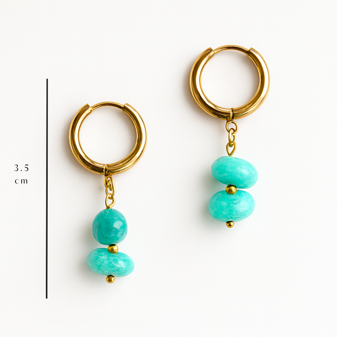 Los pendientes Nerea combinan aros dorados con dos cuentas en tonos azules de acabado marmoleado que aportan un toque luminoso a cualquier look. Fabricados en acero inoxidable resistente al agua, son ligeros, cómodos y perfectos para el día a día.