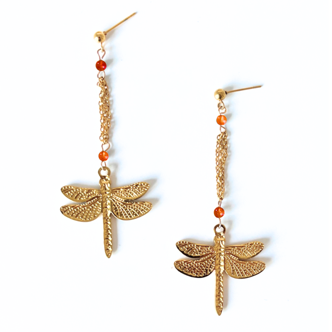 Si buscas unos pendientes elegantes, originales y con un diseño especial, los Pendientes Camila son para ti. Su forma de libélula en tono dorado aporta un aire sofisticado y femenino, mientras que sus detalles de cadena y cuentas negras crean un efecto de movimiento encantador. Son ligeros, cómodos y hechos a mano. Combínalos con un recogido o con el pelo suelto y deja que brillen con cada movimiento