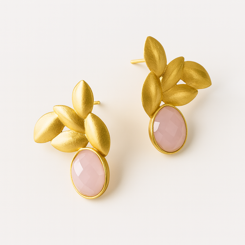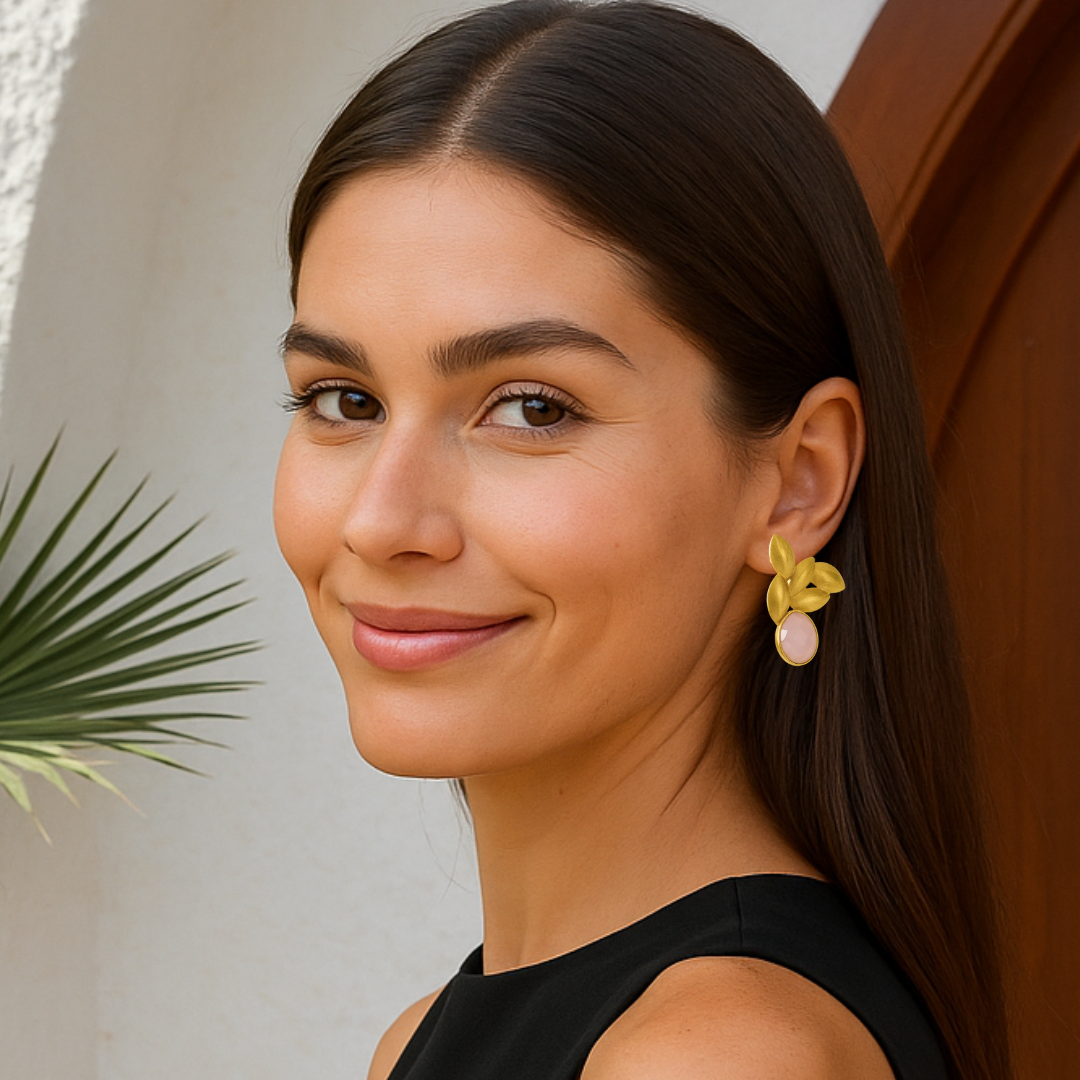 Los Pendientes Liania combinan hojas doradas de acabado mate con una piedra rosa empolvada que aporta luz sin estridencias. Son de esos pendientes que no hacen ruido, pero se notan.