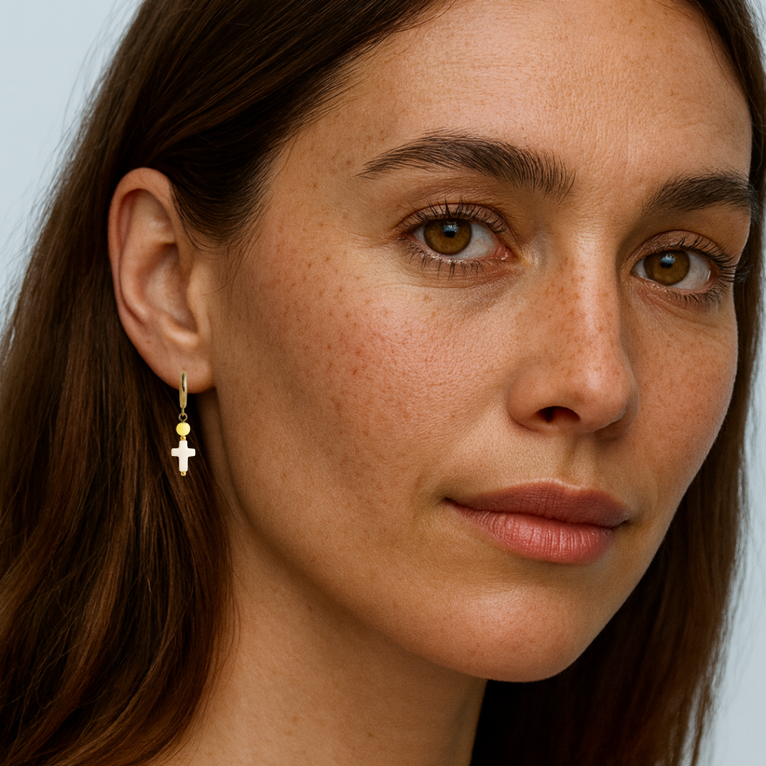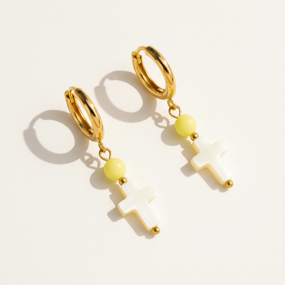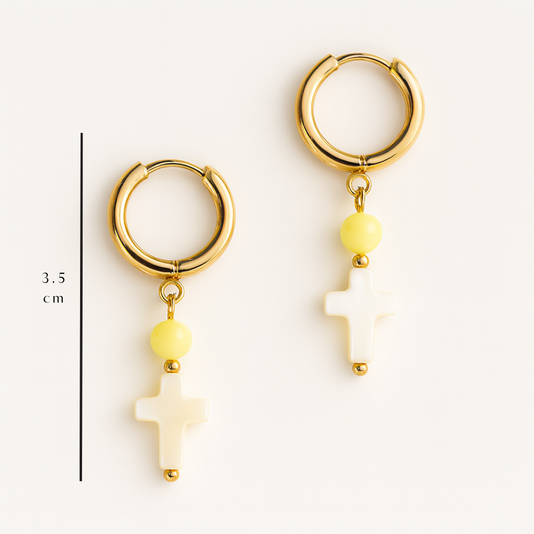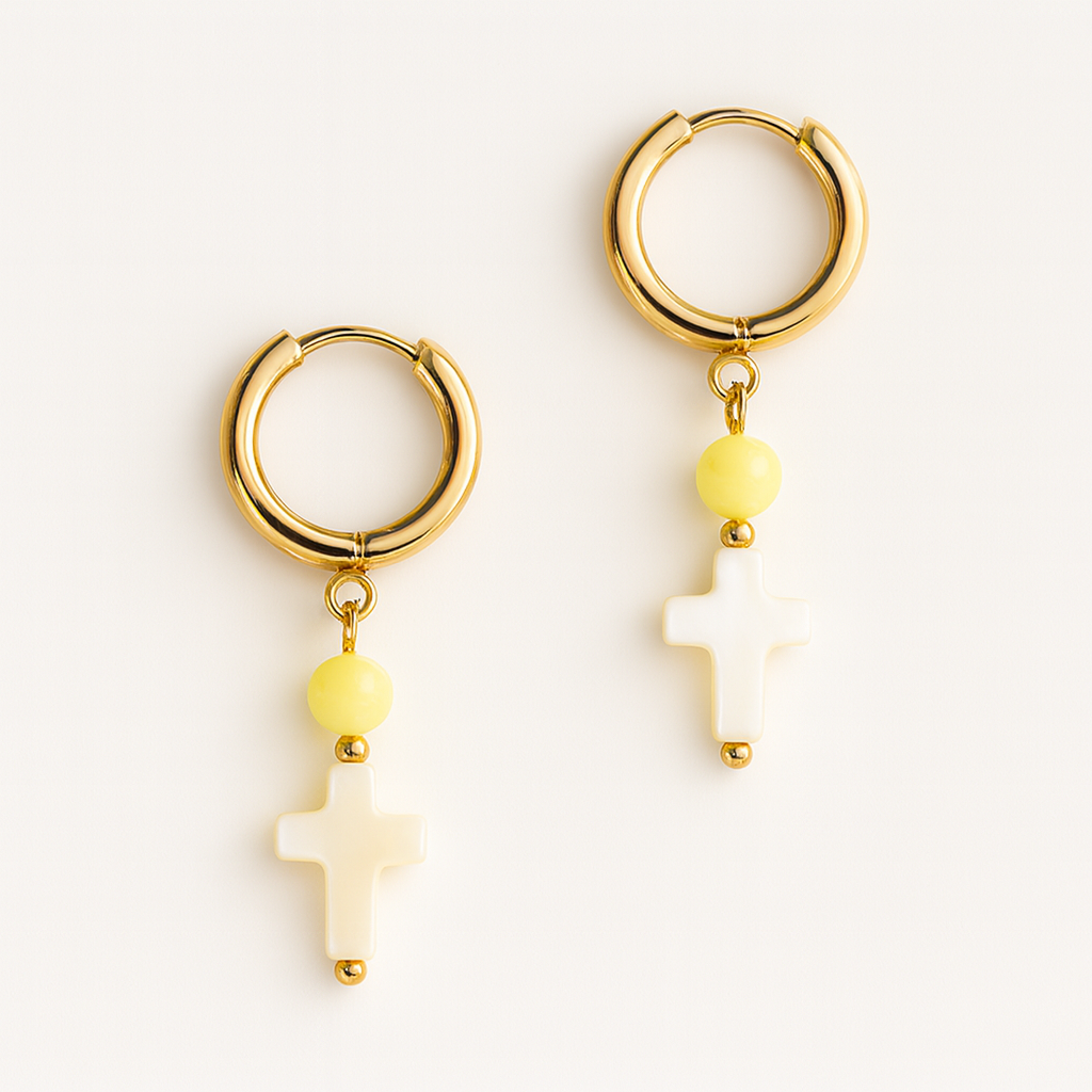 Los pendientes Solene combinan un aro dorado con una cuenta amarilla suave y una cruz nacarada que aporta un toque luminoso y delicado. Una pieza ligera, elegante y perfecta para dar luz a cualquier look.
